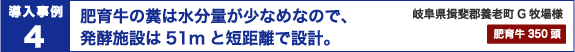 T-レボリューション導入前に利用していた発酵施設(他社製)では、スラリー状の牛糞が処理できませんでした。そうした理由から、特に水分含有率が高くなりがちな冬の糞尿処理で苦労がありました。そんな時、T-レボリューションの導入を検討しました。販売店の指導のもと、スラリー状、粘土状の糞もかき混ぜられるT-レボリューションで水分を調整し、これまで利用していた発酵施設(他社製)に移して発酵する方法を採用。冬でもスラリー状の糞尿が固形化して排出されるようになって助かっています。糞処理の労働時間が短縮できたことも嬉しい。 |